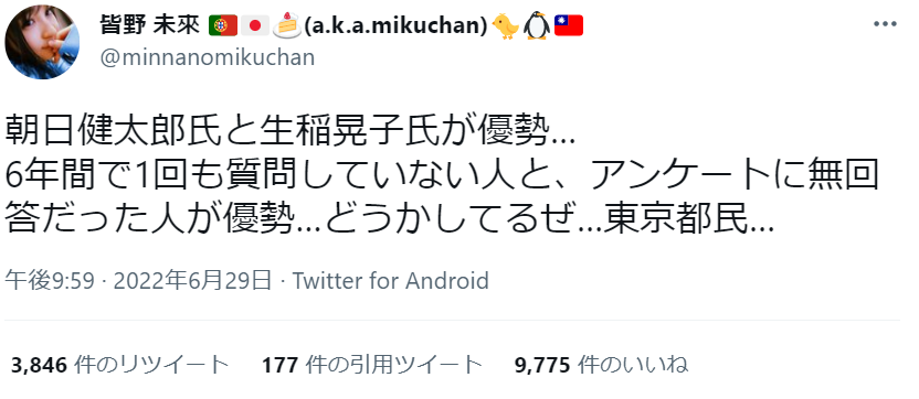東京で言えば、自民の候補、朝日や生稲に投票するような輩は北朝鮮にでも行った方がいいんじゃないか。