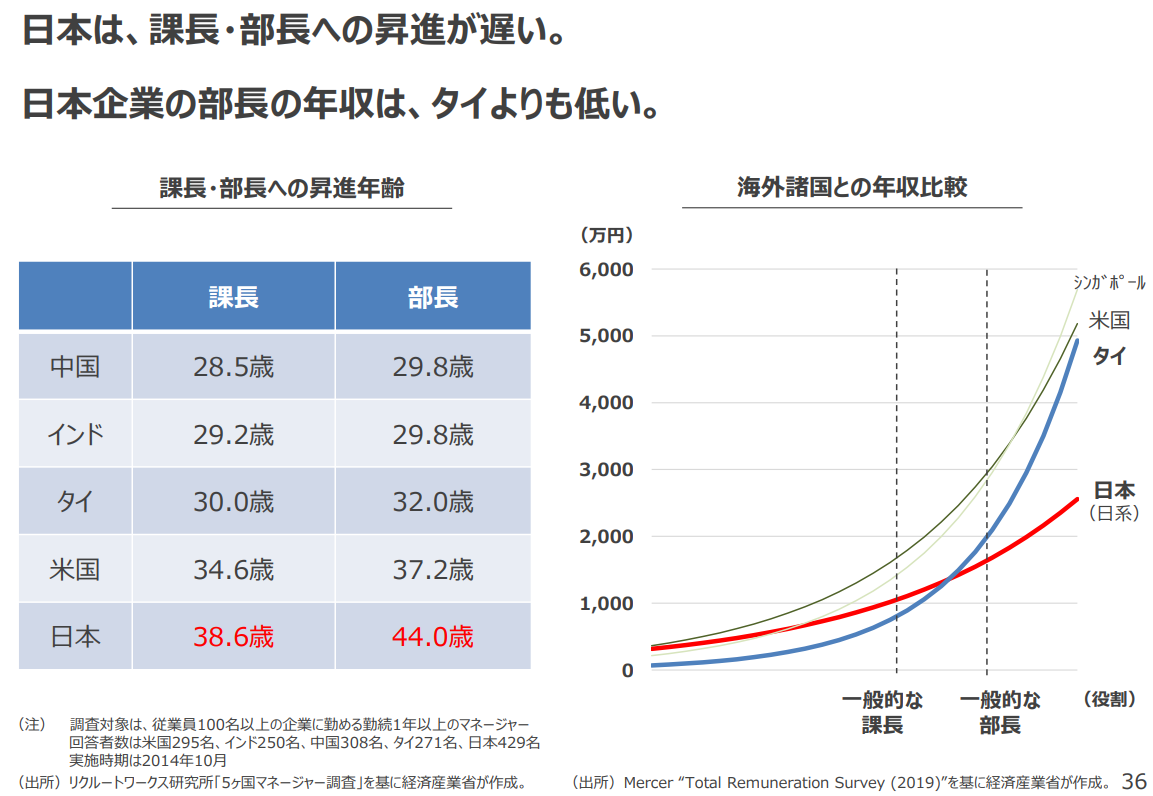 その結果がこれです。『日本の部長の給料はタイより安い』と経産省までが言い出すようになりました。経産省のレポートを見ると日本の大企業の部長の給料は約1500万円くらい、タイで2000万、アメリカやシンガポールで3000万。