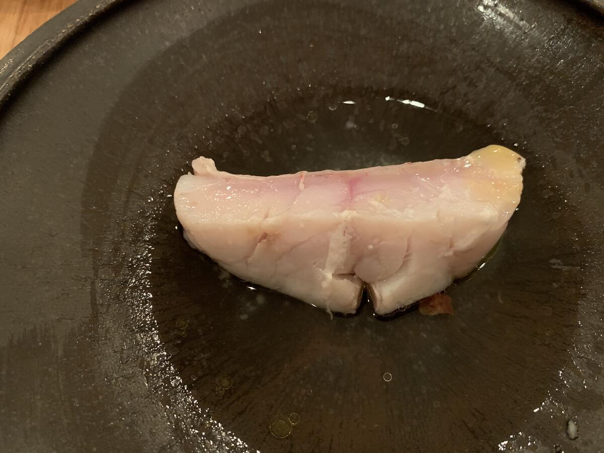 太刀魚と王様シイタケのロースト。太刀魚は内房で手で釣ったものだそうです。高温で一気に焼き上げたローストは素材の力を感じます。この日はこれが一番おいしかった。